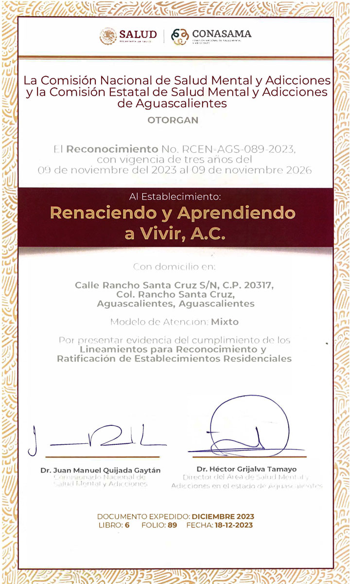 El profesionalismo y la calidad son valores que nos distinguen, gracias a esto somos la única clínica en el estado en estar reconocida y certificada verdaderamente por CONADIC, ahora CONASAMA (Comisión Nacional de Salud Mental y Adicciones) y la Comisión Estatal de Salud mental y Adicciones de Aguascalientes con el número RCEN-AGS-089-2023.